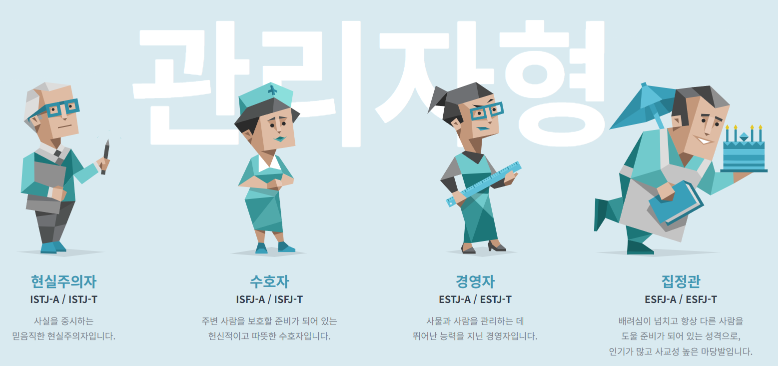 이 네 가지 지표의 조합으로 INFP, ESTJ와 같은 16가지 성격 유형이 만들어져요.