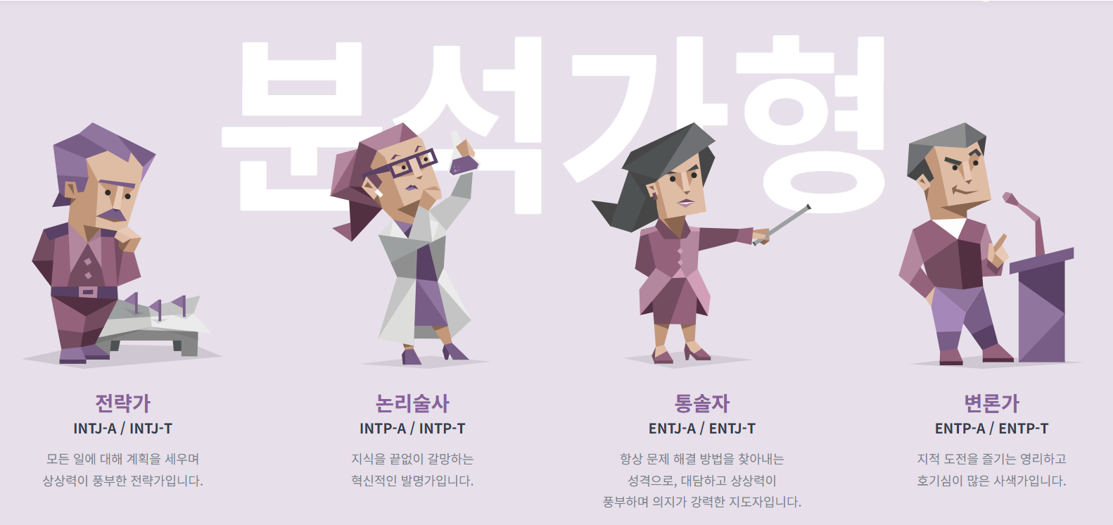 각 유형별로 강점과 약점, 적합한 직업군이 있으니 자세한 내용은 검사 결과에서 확인해보세요.