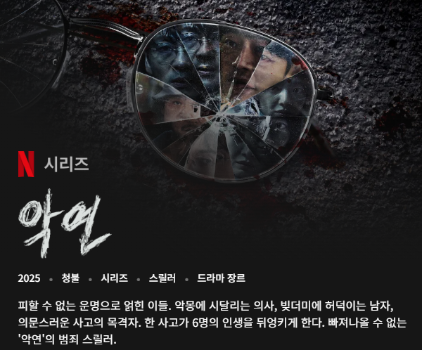 넷플릭스 오리지널 드라마 **《악연》**은 2025년 4월 4일에 공개된 6부작 범죄 스릴러로, 웹툰 《孽緣》을 원작으로 합니다. 이일형 감독이 연출과 각본을 맡았으며, 박해수, 신민아, 이희준, 김성균, 이광수, 공승연 등 화려한 캐스팅이 돋보입니다 .
